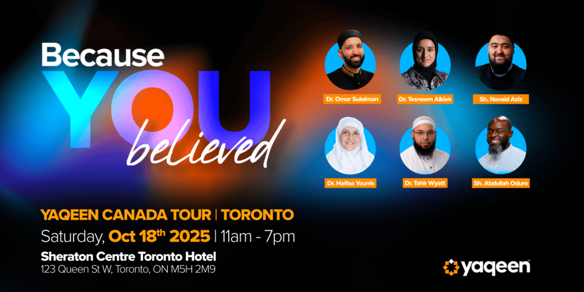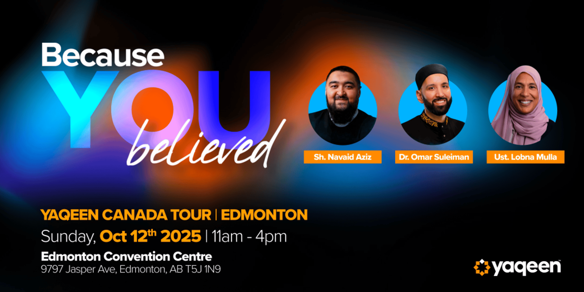 Your unwavering support helped build a platform that confronts doubt with clarity, moves forward with conviction, and honors the legacy that shapes our ummah. Your generosity places you in the legacy of believers who chose action over silence and courage over complacency. Because of your support, we’re honored to invite you to the Yaqeen Canada Tour, a three-city tour convening of reflection, inspiration, and community. Come together with believers from across the country for powerful sessions led by Dr. Omar Suleiman, Dr. Tahir Wyatt, Dr. Haifaa Younis, and more across the three cities.